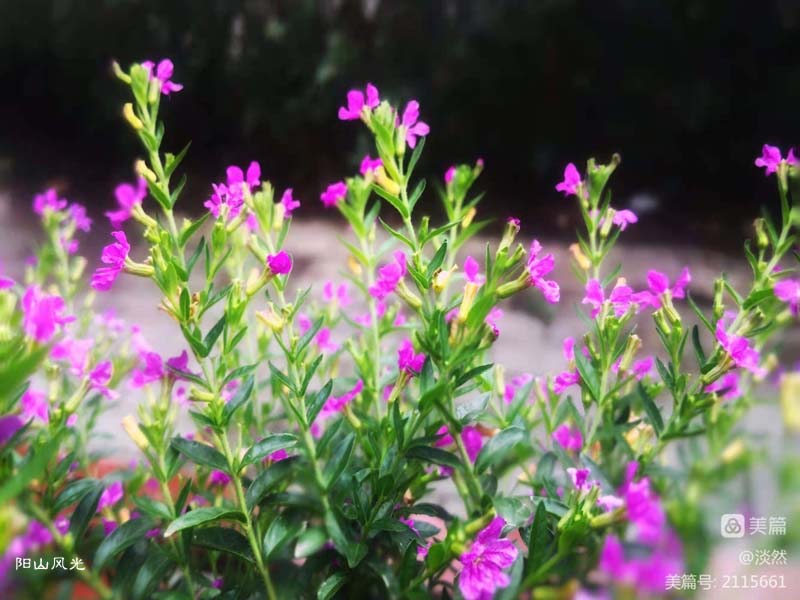 株蔓低垂萼距花,分枝多产墨西哥。开花茂盛星懸地,花色纯正为品佳。