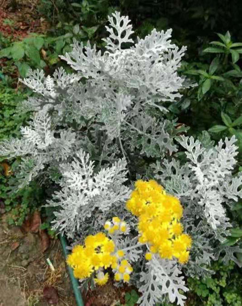 草本花枝银叶菊,来今巴囯地中海。叶中两面白毛被,好像雪花美丽彩。