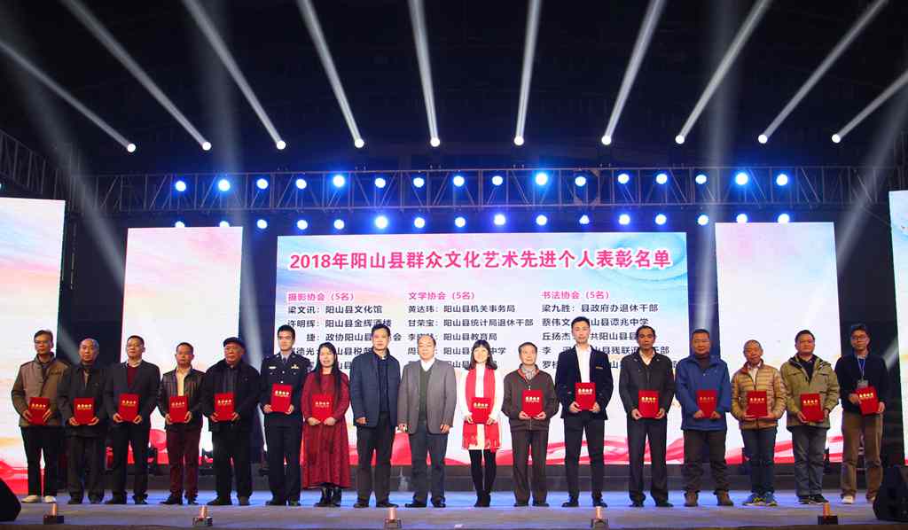 2018年我县以“坚持文化自信,推动社会主义文化繁荣兴盛”为主线,以“为社会主义服务、为人民群众服务”为工作出发点,大力发展文化建设和群众文化艺术工作,并取得了较好成绩。为奖励和扶持群众文化作品创作,营造“百花齐放、百家争鸣”的群众文艺创作氛围,更好地传承和弘扬传统民间民俗文化,丰富全县人民群众的精神文化生活,提升我县文化软实力。晚会对2018年“善美阳山·百姓舞台”优秀组织奖13个、2018年“中国·阳山韩愈学术交流会文艺晚会”优秀节目奖6个、2018年获市以上金奖(获一等奖)以上奖项的艺术作品的先进集体和戴苏平等34名在推动我县群众文化艺术繁荣兴盛工作中表现突出、成绩显著的先进个人进行了表彰。